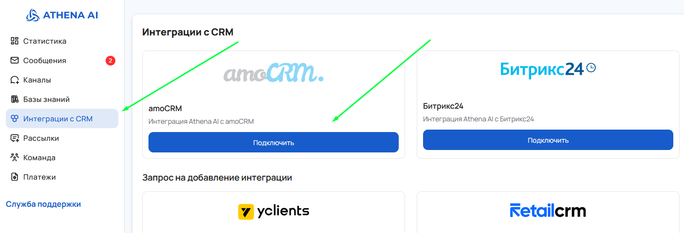 - Для подключения amoCRM перейдите в раздел «Интеграции с СРМ».