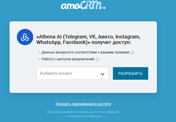 - Выберите нужный аккаунт amoCRM – нажмите «Разрешить».