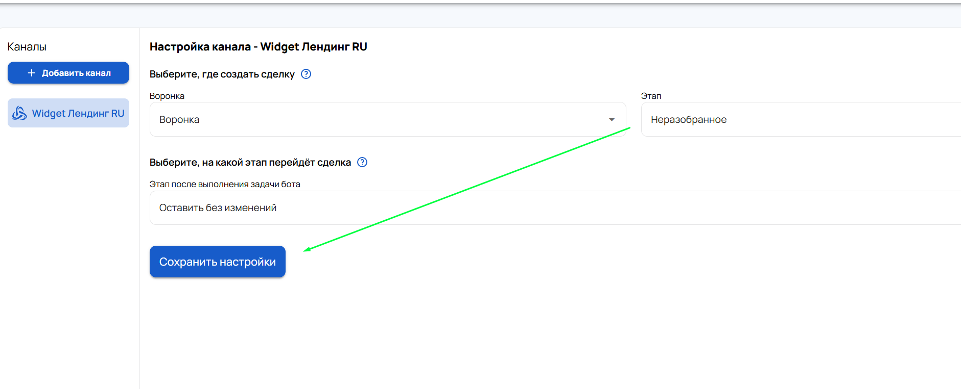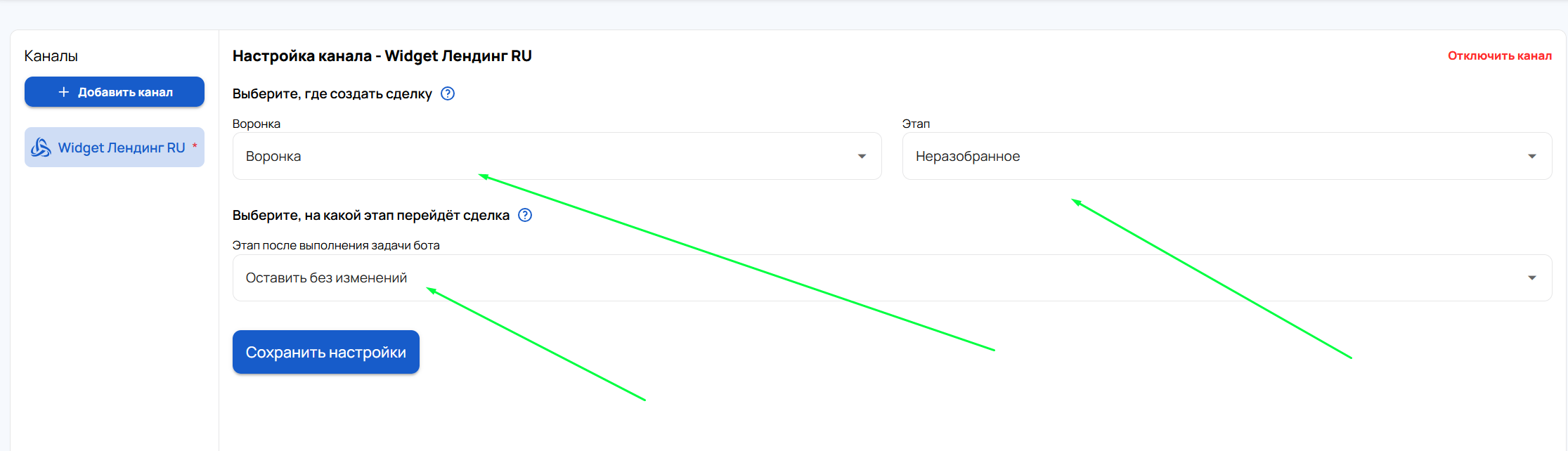 - После завершения настроек нажмите «Сохранить настройки».Интеграция готова к работе. Все сделки от Афины будут создаваться в соответствующем разделе воронки amoCRM.