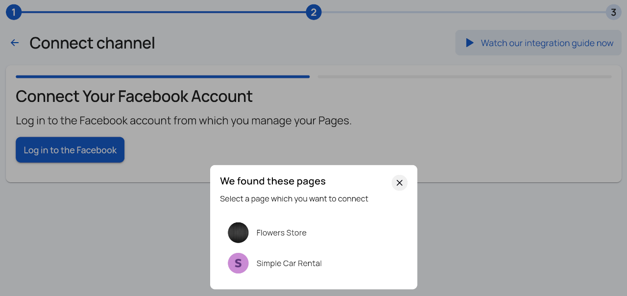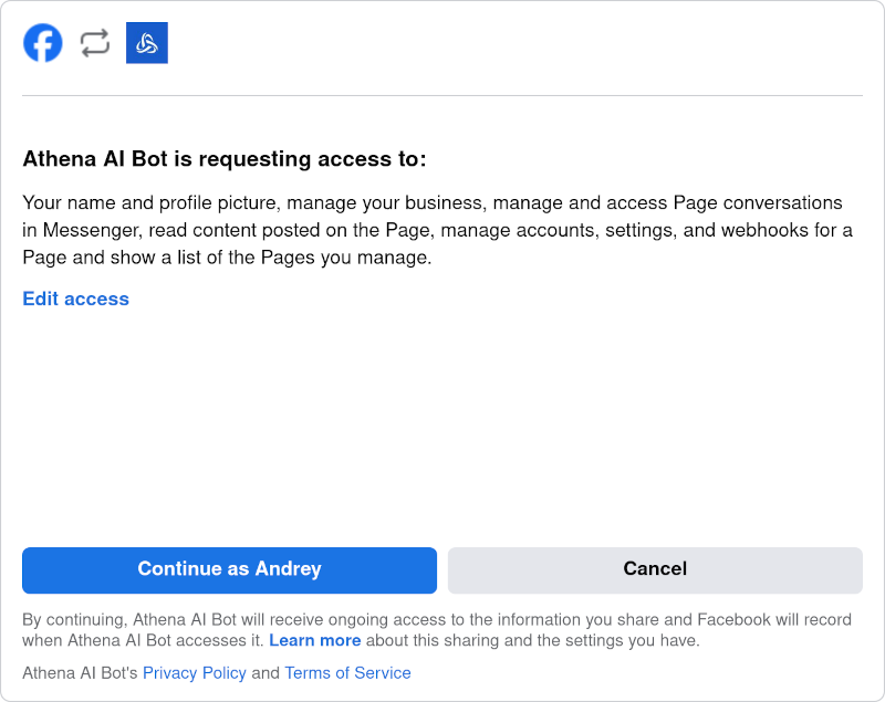 - In Athena, go to the "Channels" section, click "Add Channel," select Facebook, and click the "Log in to Facebook" button.